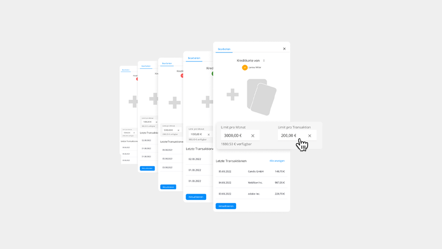 Beliebig viele Kreditkarten pro Mitarbeiter sind in wenigen Minuten angefordert und mühelos ausgegeben. Individuelle Budgets und hohe Limits legen Sie ganz einfach per Klick fest, pro Person, Team oder auf Projektebene. Ohne Gebühren, ohne Warten, ohne Gang zur Bank.