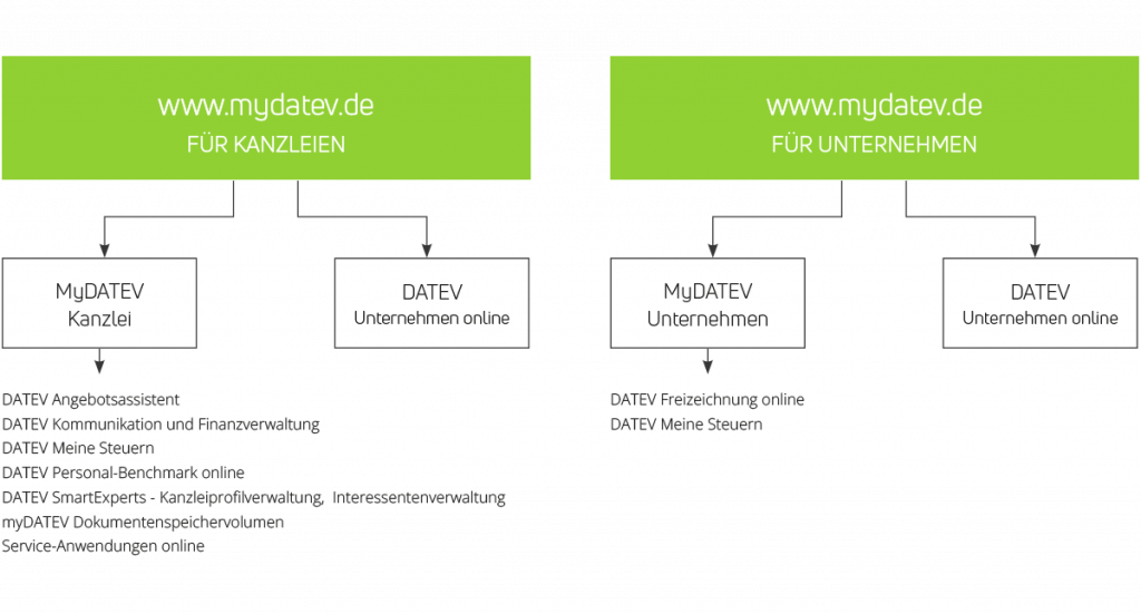 Die Anwendungen werden stetig durch die DATEV erweitert! Mit nachstehender Grafik erhalten Sie einen schnellen Überblick über die Anwendungen, die bereits jetzt in dem MyDATEV Portal finden können.