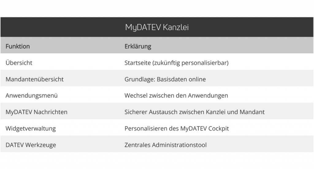 Für ein einfaches Handling im MyDATEV Portal der Kanzlei stehen Ihnen aktuell folgende Funktionen zur Verfügung: