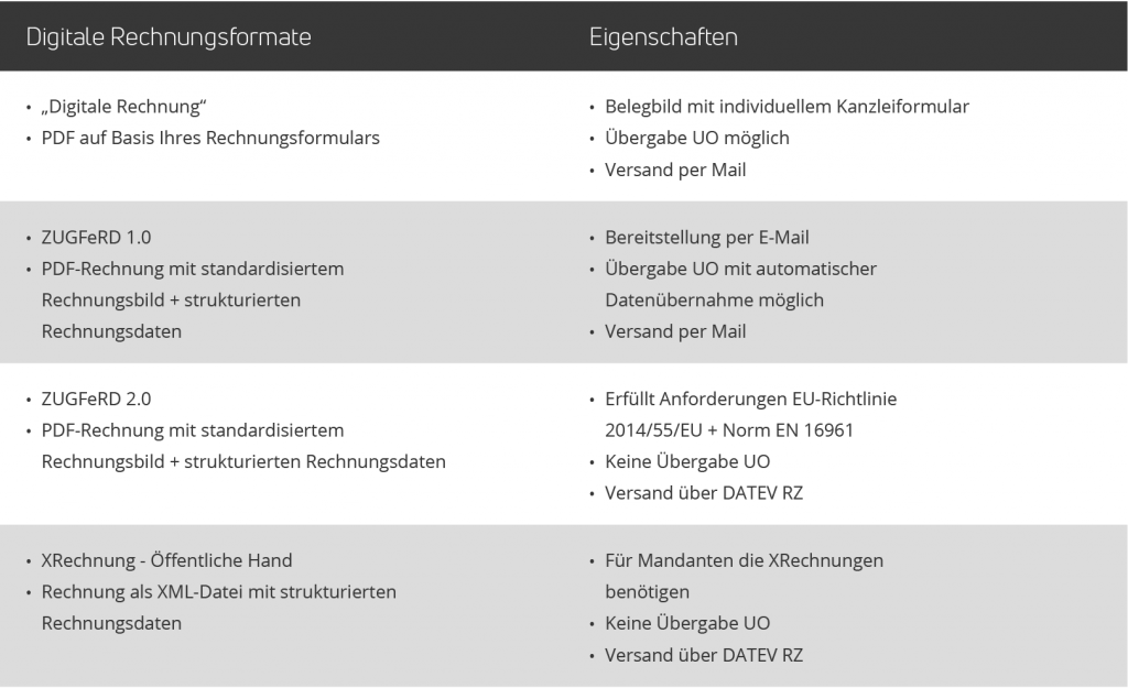 Beim Aufbau der Rechnung können Sie sich pro Mandant für folgende Formate entscheiden: