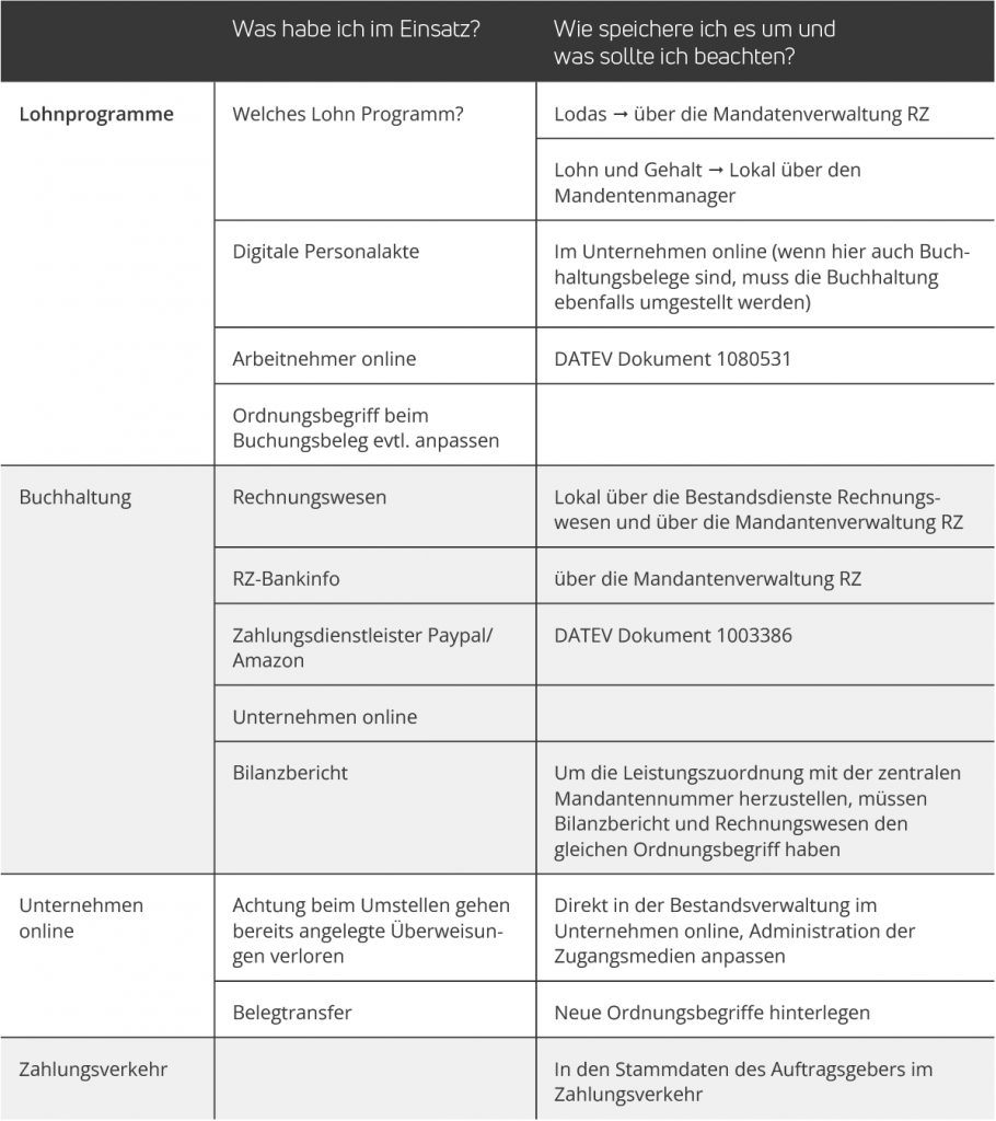 Bevor Sie mit der Umstellung starten, sollten Sie prüfen, welche Programmfunktionen bei diesem Mandat genutzt werden und welche Programme im direkten Zusammenhang mit der Anwendung stehen. Sollte ein Mandat, bei dem die Buchführung umgestellt werden soll, neben digitalen Belegen auch die digitale Personalakte nutzen, so muss zum Beispiel auch die Lohnanwendung angepasst werden. Wenn dies nicht der Fall ist, jedoch der Buchungsbeleg an die Buchhaltung weitergegeben wird, so muss ein abweichender Ordnungsbegriff im Lohnprogramm hinterlegt werden.