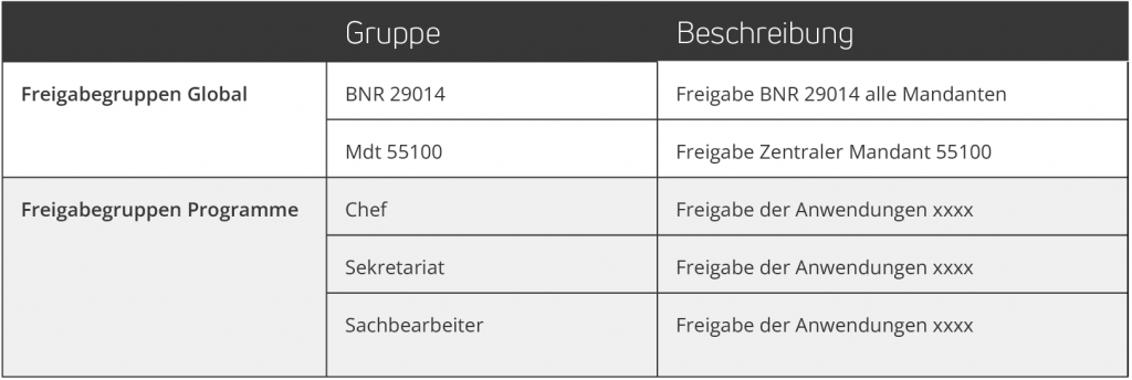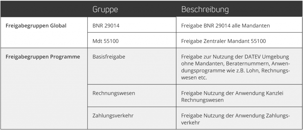Die DATEV Rechteverwaltung arbeitet im Sperrprinzip und/oder Freigabeprinzip. Da der Ursprung der heutigen DATEV Rechteverwaltung in der ehemaligen Nutzungskontrolle (NUKO) liegt, wurden bei der Umstellung von der NUKO auf die DATEV Rechteverwaltung allen Benutzern (automatisch) erst einmal die meisten Rechte freigegeben (Gruppe ‚Alle Freigaben‘), damit die bestehenden Sperrgruppen in den Kanzleien bestehen bleiben können und somit wird das Sperrprinzip simuliert.