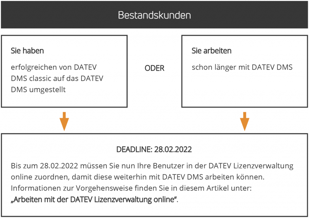 Wer mit dem DATEV DMS arbeiten möchte, benötigt hierfür eine Benutzerlizenz pro Anwender. Dies ist für Bestandskunden (insbes. Umsteller von DATEV DMS classic auf DATEV DMS) bisher noch nicht zur Anwendung gekommen – wird nun aber zur Pflicht. Nachstehend finden Sie Termine und Details, die in den nächsten Monaten zu berücksichtigen sind.