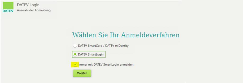 Falls Sie bei der Anmeldung an eine DATEV Online Anwendung das Anmeldeverfahren durch setzen des Hakens festgelegt hatten, …